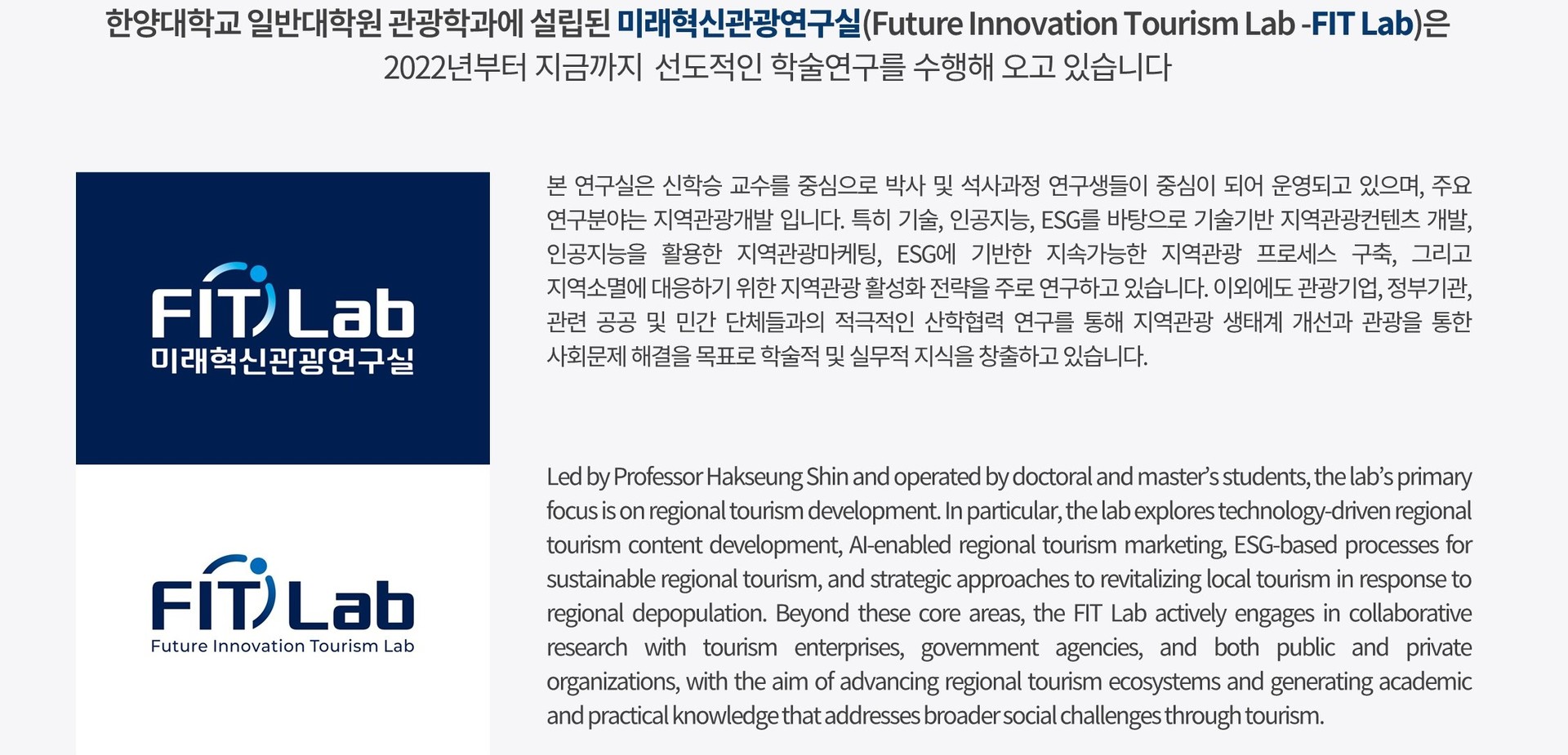 The Future Innovation Tourism Lab (FIT Lab), established in the Department of Tourism Science at the Graduate School of Hanyang University, has been conducting leading-edge academic research since 2022. Led by Professor Hakseung Shin and operated by doctoral and master’s students, the lab’s primary focus is on regional tourism development. In particular, the lab explores technology-driven regional tourism content development, AI-enabled regional tourism marketing, ESG-based processes for sustainable regional tourism, and strategic approaches to revitalizing local tourism in response to regional depopulation. Beyond these core areas, the FIT Lab actively engages in collaborative research with tourism enterprises, government agencies, and both public and private organizations, with the aim of advancing regional tourism ecosystems and generating academic and practical knowledge that addresses broader social challenges through tourism.